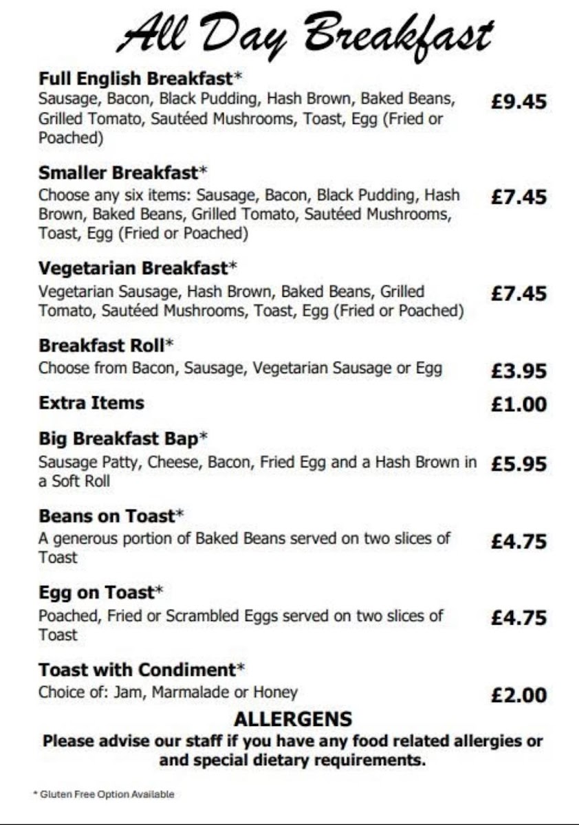 Choose any four items: Sausage, Bacon, Black Pudding, Hash Brown, Baked Beans, Grilled Tomato, Sauté Mushrooms, Toast, Egg (Fried or Poached)